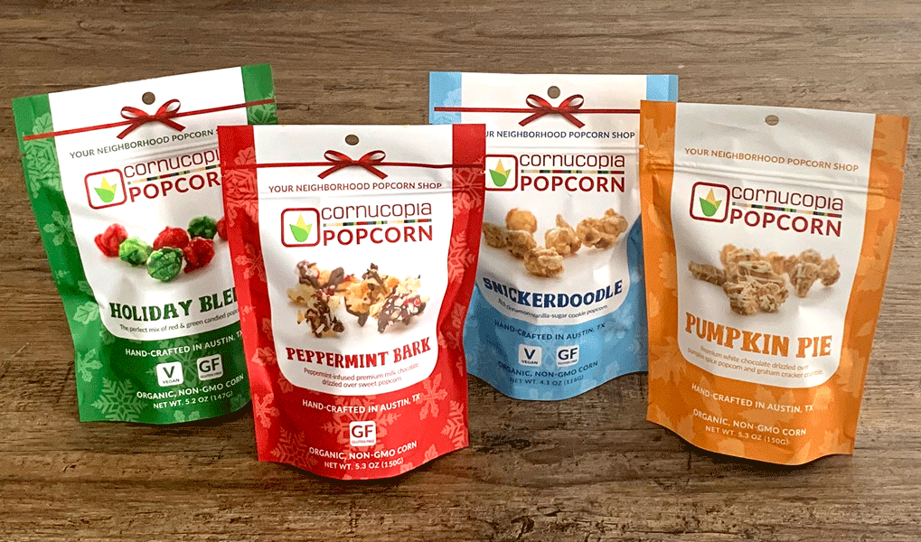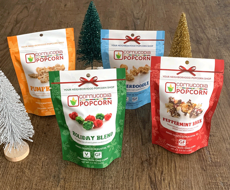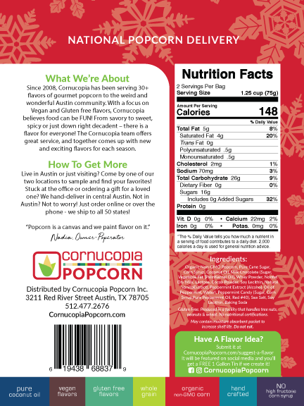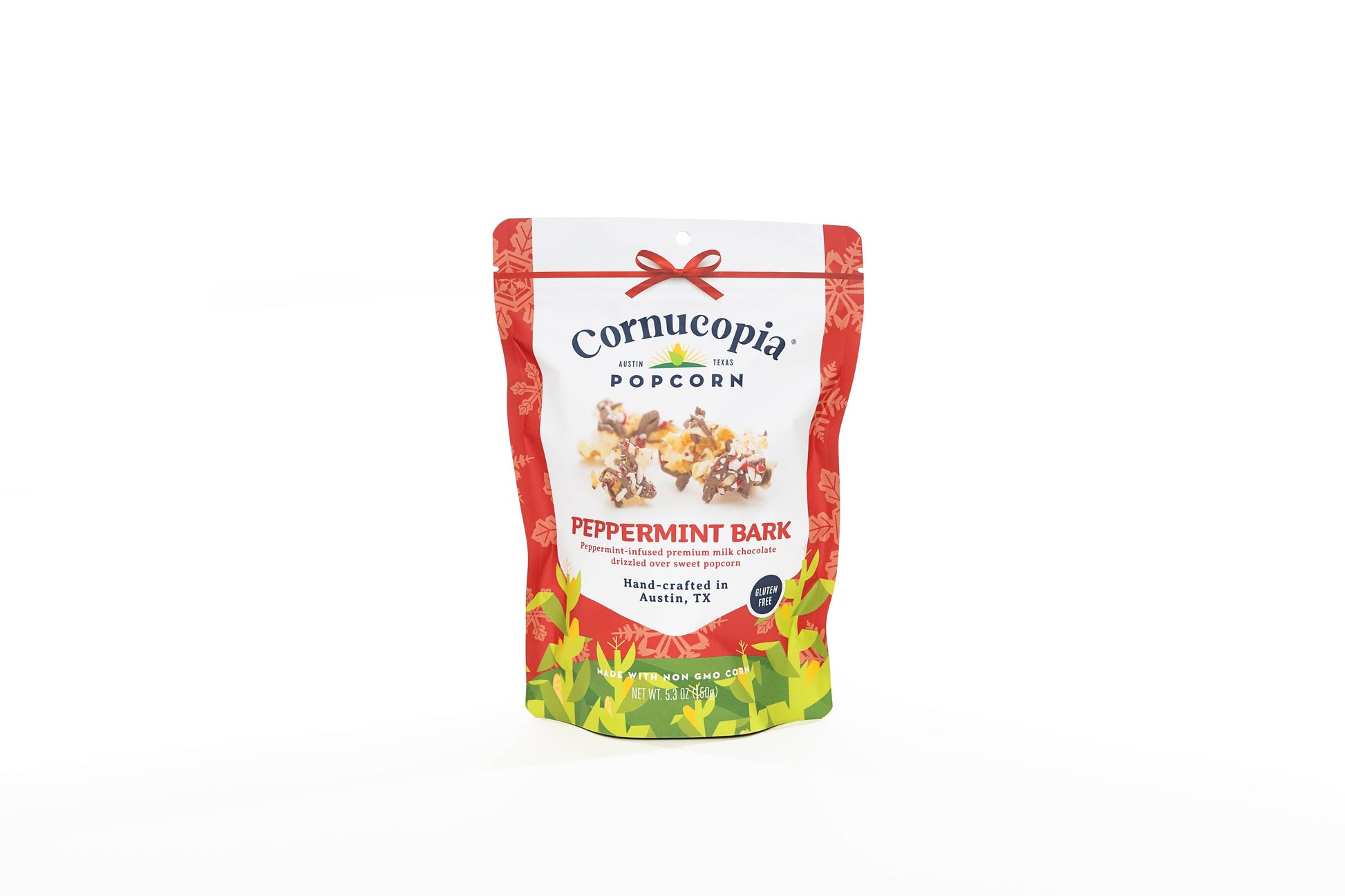 Candied-Peppermint Popcorn drizzled with milk chocolate and crushed peppermints.