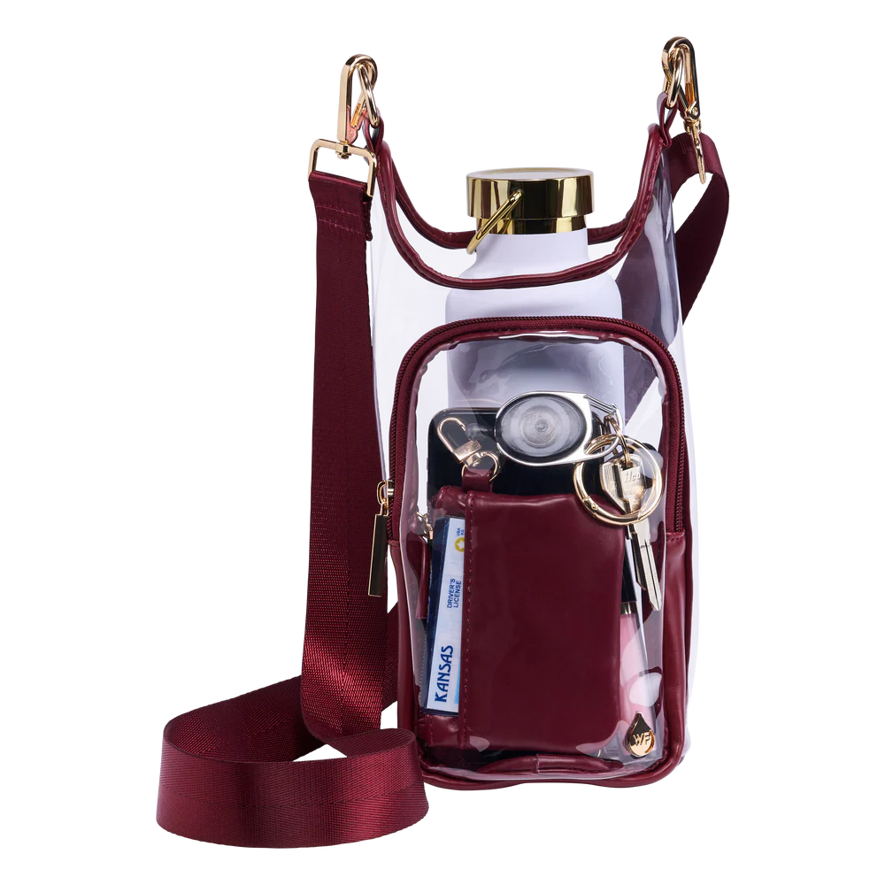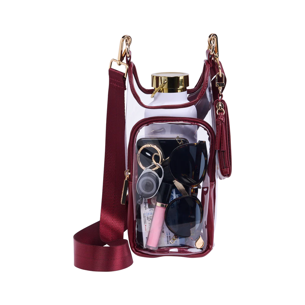 This Clear HydroBag® Stadium with Maroon Trim and Matching Pouch is a stylish accessory for any fan who wants to be "game day ready"! It's the perfect crossbody bag to carry your water bottle, keys, cards, and cash hands-free, you won't even break a sweat! Score the winning look and show your team spirit!