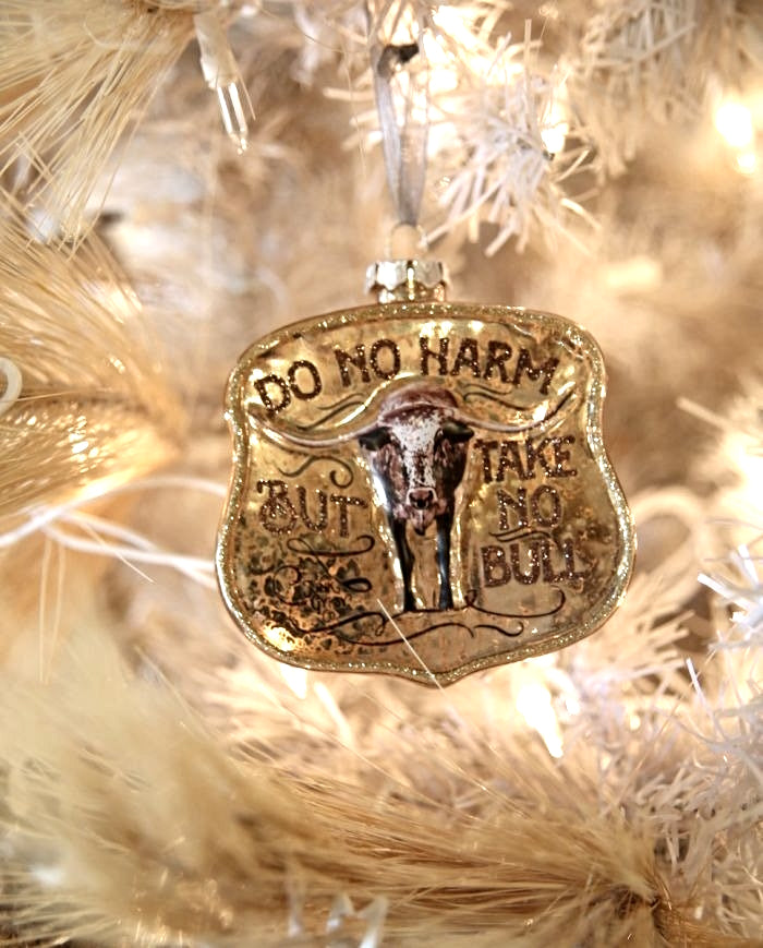 Do No Harm But Take No Bull Ornament ~ This Fun ornament has the look of old mercury glass with the notable saying for that something different