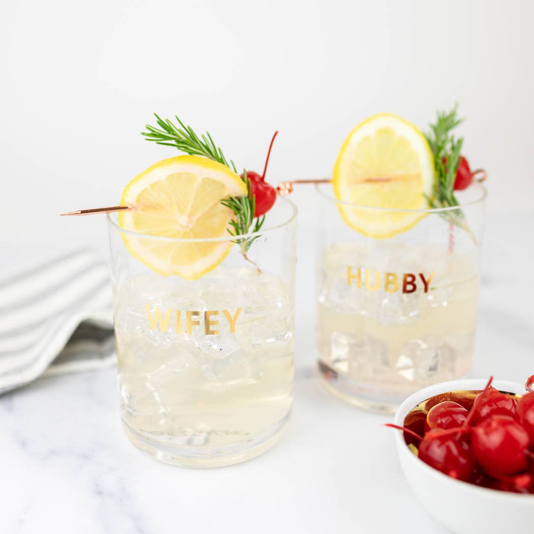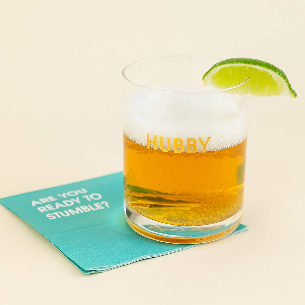 Crush your cocktail in style with our "Hubby" gold foil rocks glass. 13.25 oz. Rocks Glass, Gold Foil Printed Hand wash only.