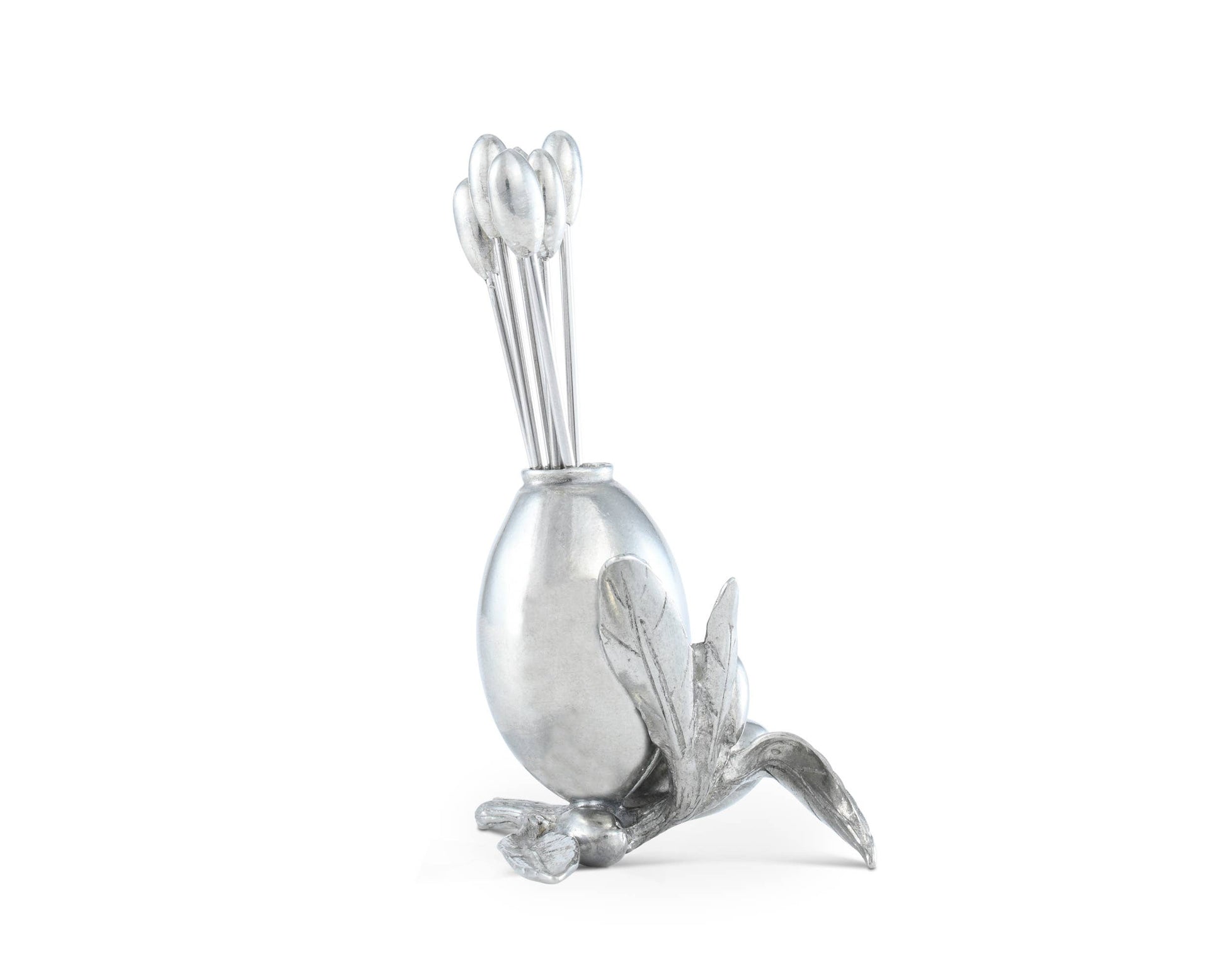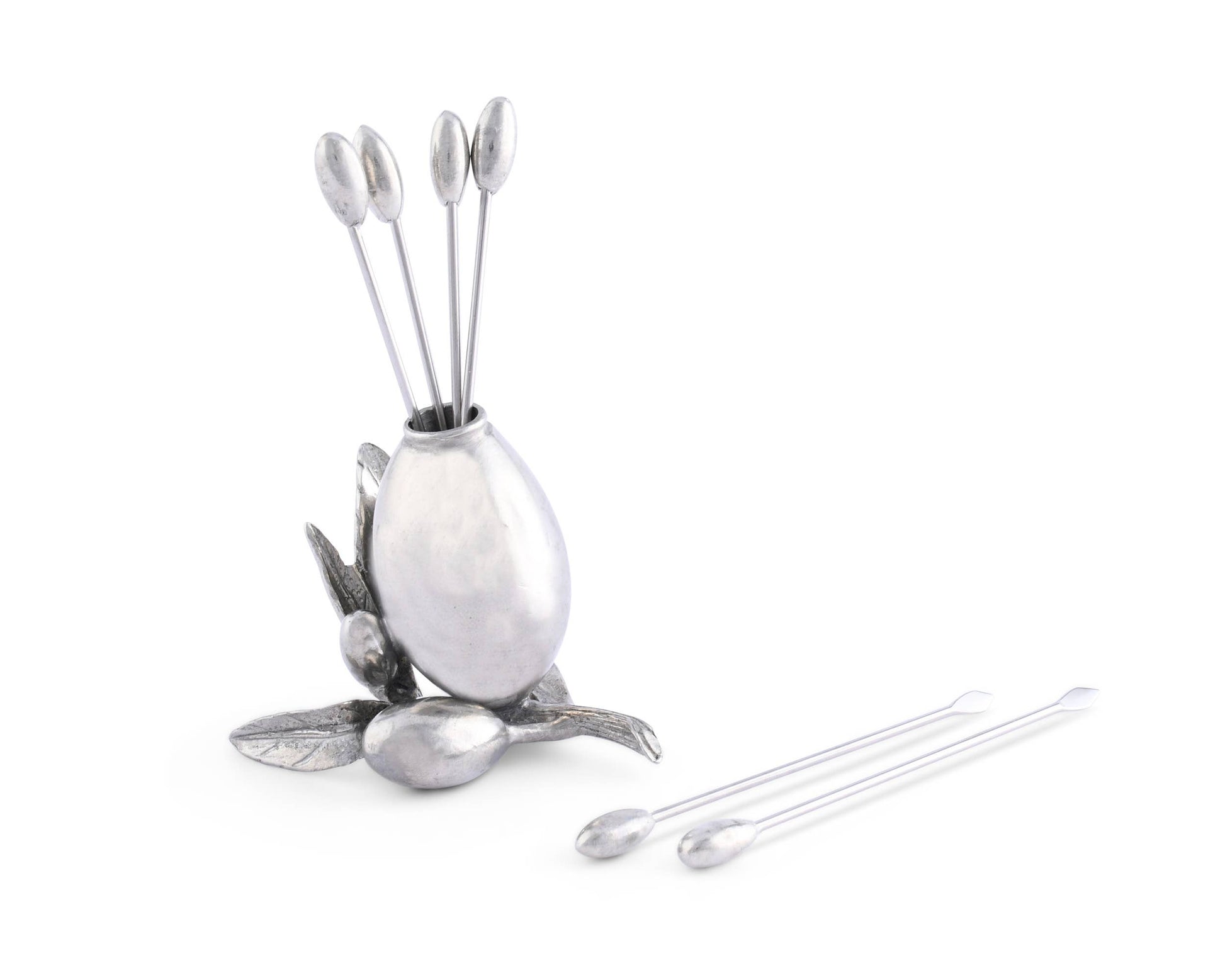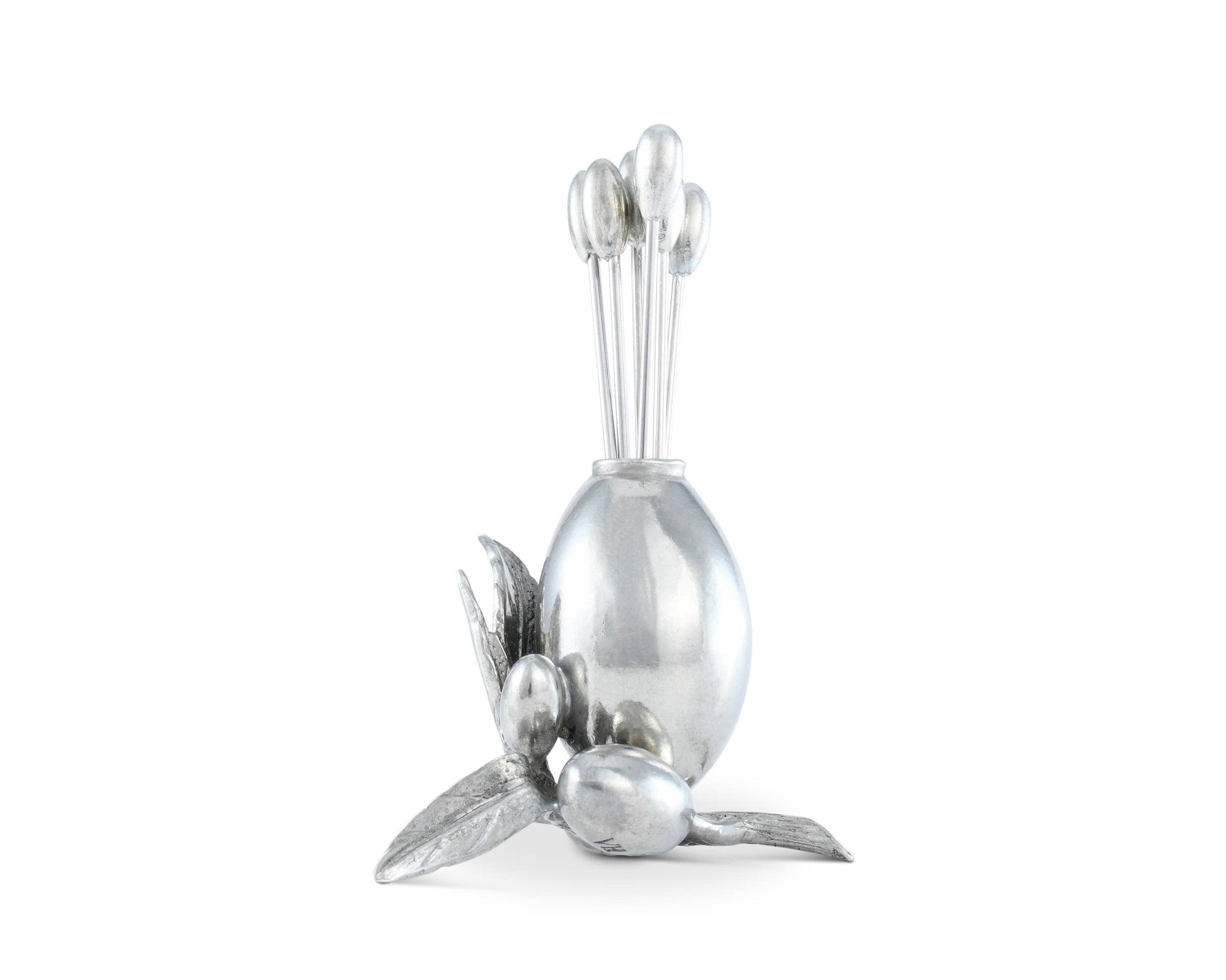 Bring a bit of Mediterranean art and joie de vivre to your cheese service with our Olive Cheese Pick Set. Hand-cast in luxury pewter as a miniature still life of a fruit laden Olive twig, the holder has six picks, each topped with a tiny pewter olive. Size: 1"W x 1.5"L x 4"T Care: Hand wash only and wipe dry with soft cloth