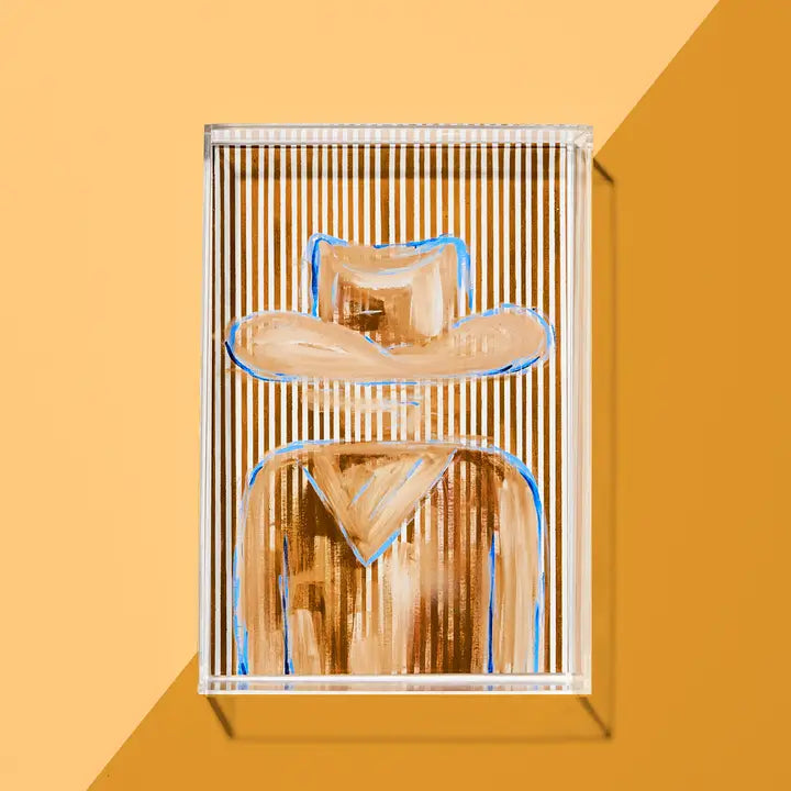 Saddle up with the Outlaw Small Tray! This acrylic tray features a bold stripe cowboy painted by Emma Katherine, perfect for adding a touch of character to any space. Round up your friends and serve drinks or snacks in style with this unique tray. Giddy up! -Size: 6.5’’ L x 9.5’’ W x 1.5’’ H -Trays are sold individually -Made of acrylic -Handmade with love in Dallas, Texas -Use a soft damp cloth to clean and keep inside