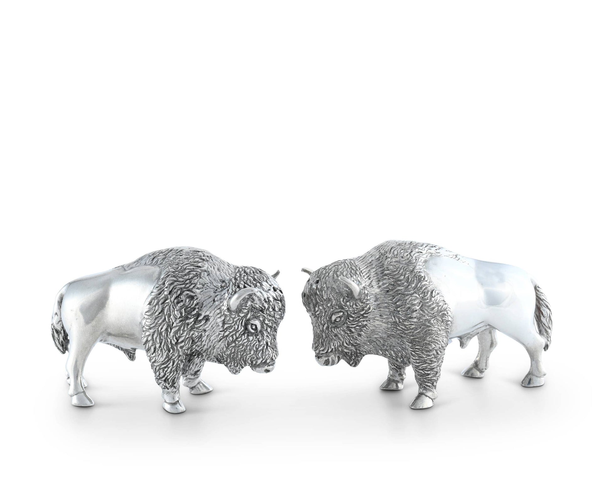 Vagabond House's Bison Salt and Pepper Set is crafted in richly detailed luxury grade pewter. Accurately detailed from their solid hooves to the tips of their horns, this set is a perfect table accent for a western ranch themed celebration or home. Wonderfully detailed and realistic Vagabond House Pewter Salt and Pepper sets make perfect gifts for nuptials, housewarming, collectors or just because. Size: 4.5" W x 2" L x 3" T Care: Hand wash recommended. If using dishwasher, choose lowest heat and non-acidic soap