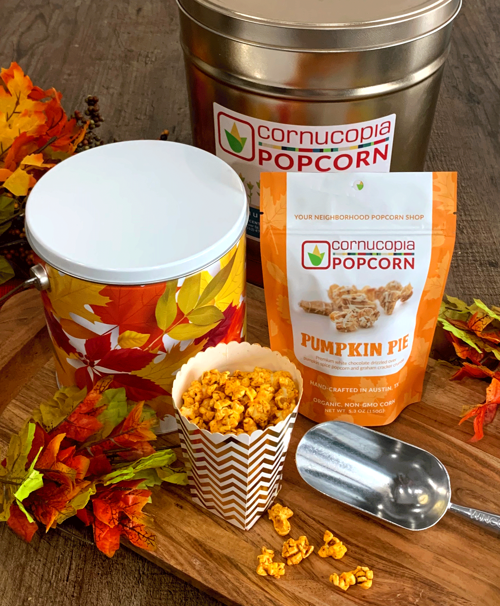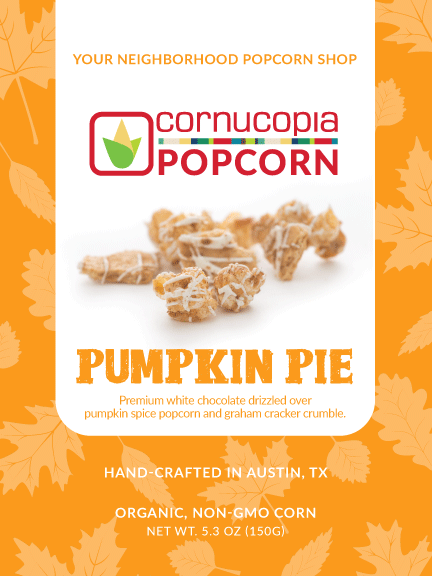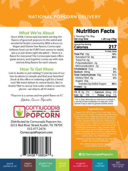 Pumpkin spice popcorn, topped with white chocolate and crushed graham crackers.