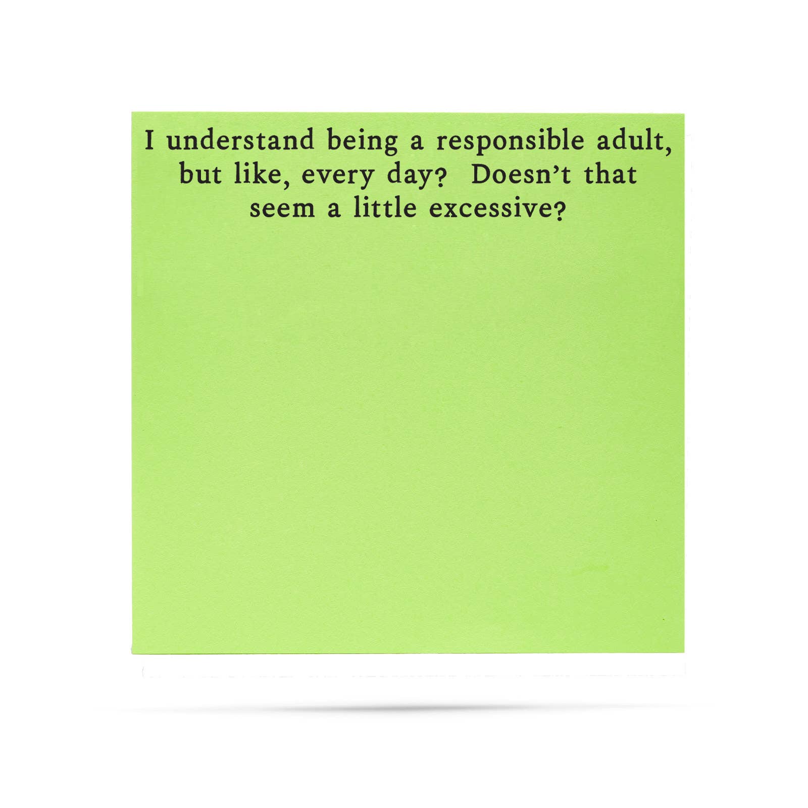 We are so excited about our new sticky notes! Each pad comes with 100 3" x 3" sheets of neon paper and are printed with some of the funniest sayings around! KEYWORDS: I understand being a responsible adult, but like everyday, doesn't that seem a little excessive? These notes make fun mom gifts,
