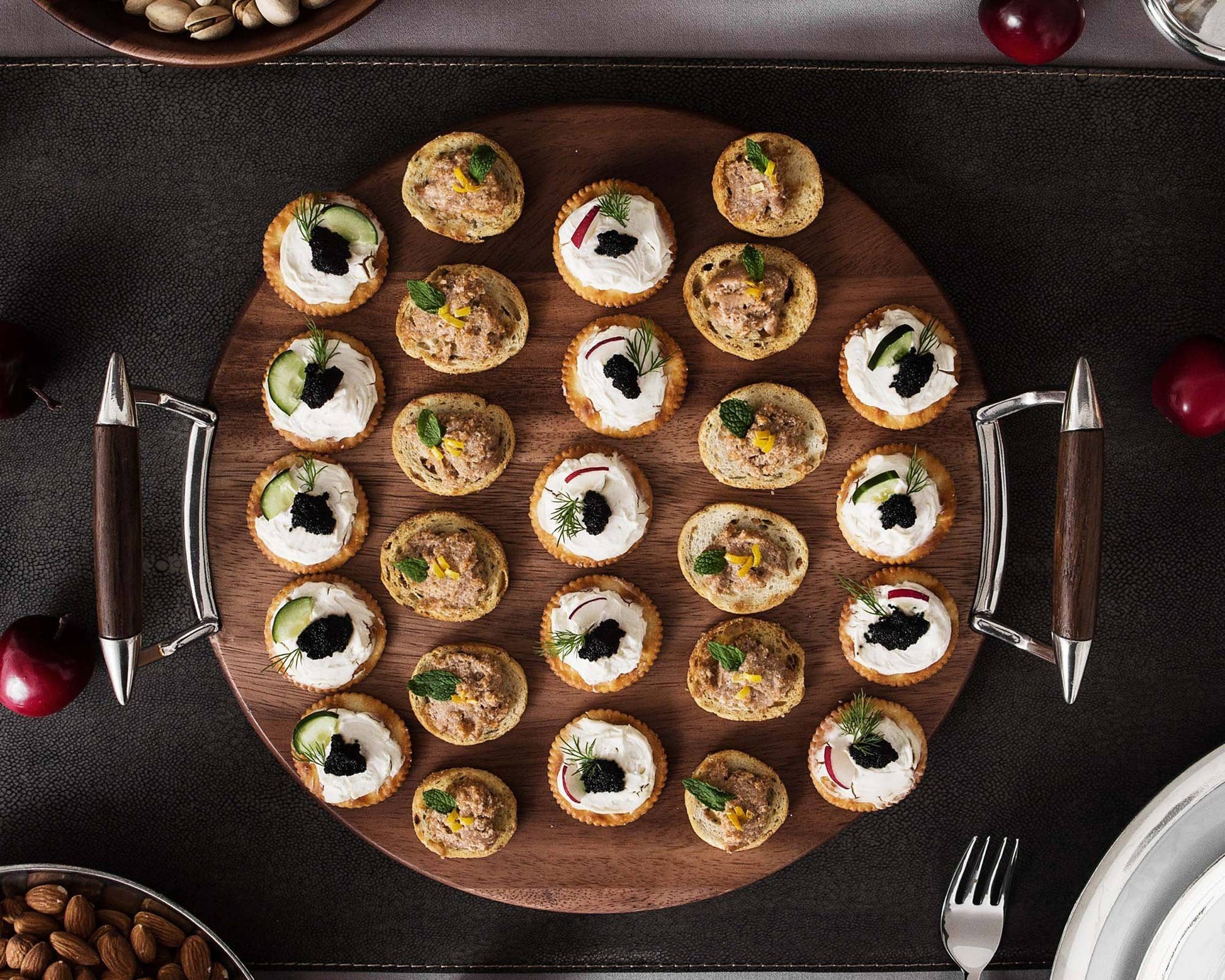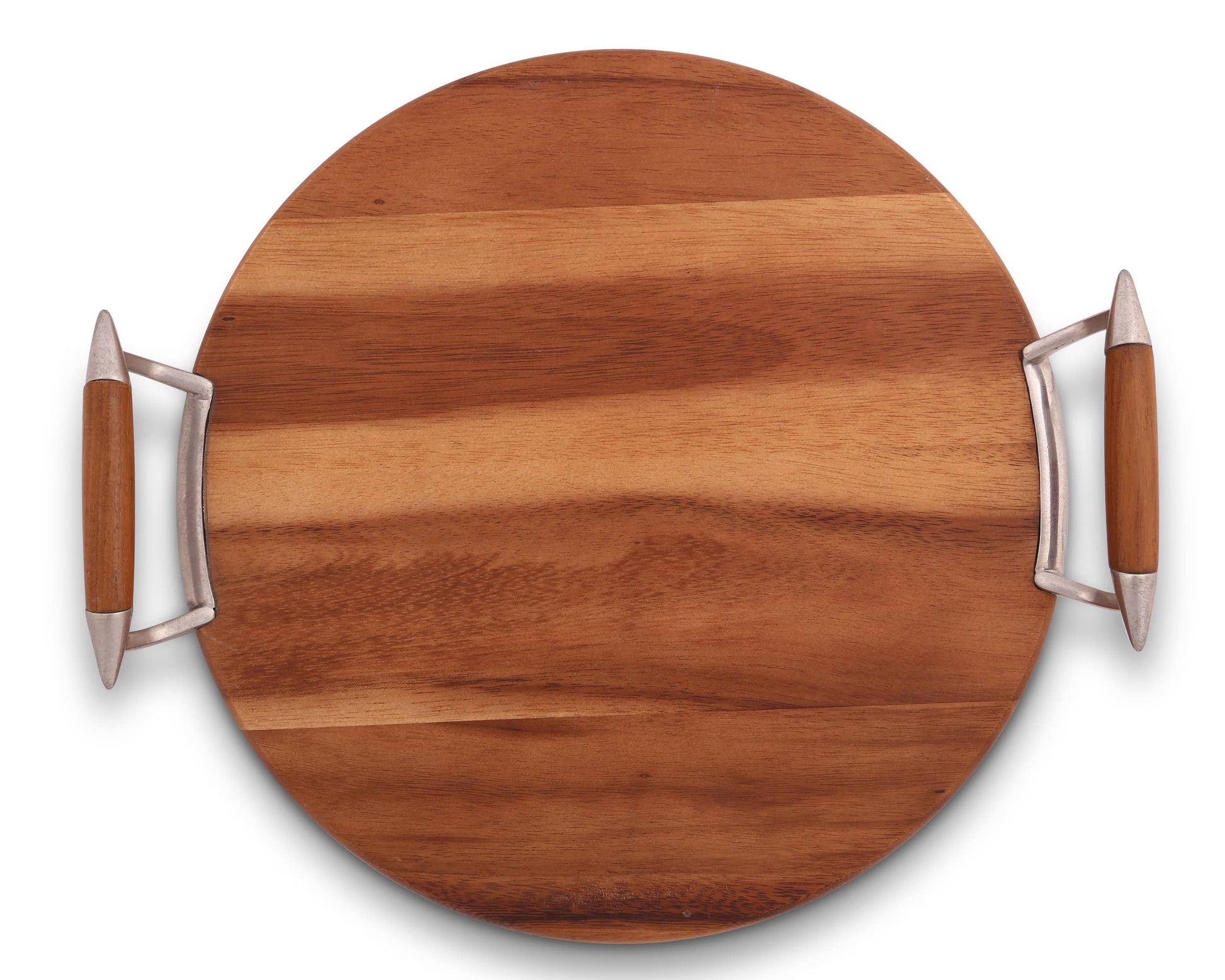 Vagabond House's classic round cheese board meets Mid-Century Modern style when crafted in hard-working, beautifully colored teak. A pair of comfortable round teak handles are fitted with pewter for a high fashion style and easy service. Sleek and slightly sexy, Vagabond House's Tribeca Collection embodies urbane sophistication and mid-century modern style. Size: 13"L x 15.5"W x 2.5"T Care: Wood Care: Oil 1x when new, then yearly with mineral oil; let soak in 1 hour or more, wipe off.